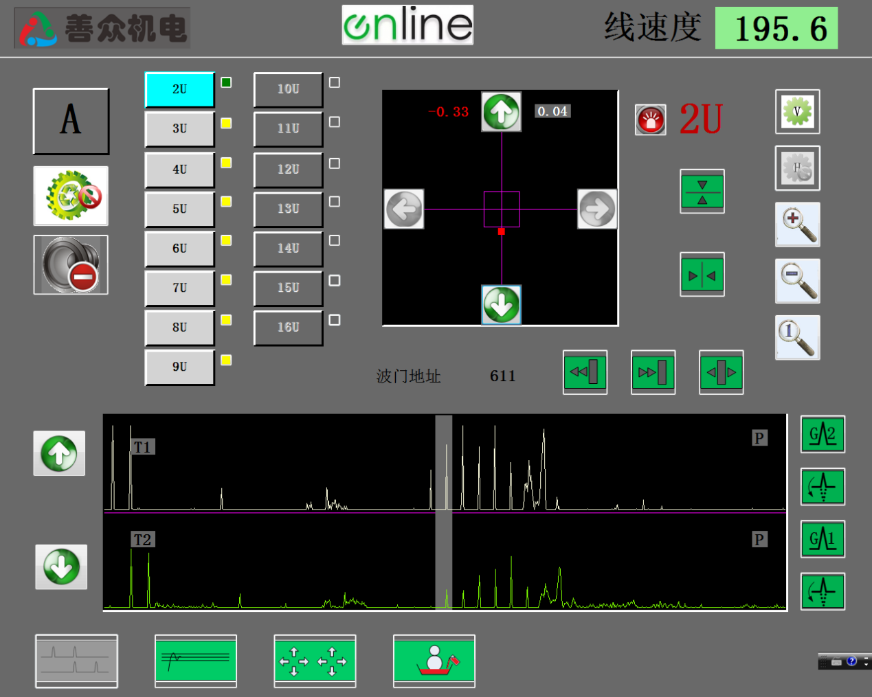 - 可以显示每一色组电眼信号实际波形及门控波形,波形显示区域可显示版辊一周的波形,在速度变化时无需任何调节自动保持最佳波形显示效果。